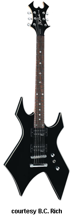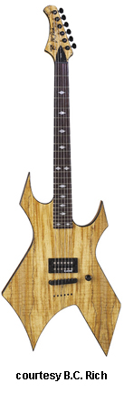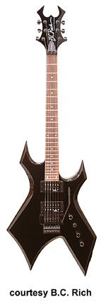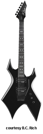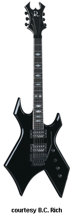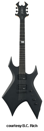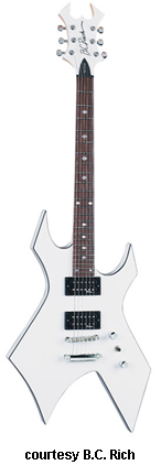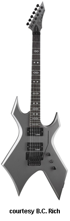 Warlock (Platinum Series) | - similar to the Warlock U.S. Bolt-On Neck, except has 24.75 in. scale, white inlay dots, B.C. Rich angled headstock with Platinum logo, six-on-one-side die-cast tuners, chrome hardware, accu-tune tremolo, additional toggle switch, available in Black, Metallic Red, Tombstone, or White finish, disc. 2006. |