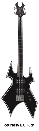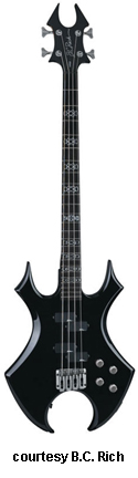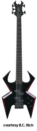 WARBEAST TRACE BASS | - offset double cutaway basswood body with pointed horns, a lower V-shaped cutout, and beveled edges, bolt-on maple neck, 24-fret ebony fingerboard with parallel silver lines, Beast-style headstock with black overlay and logo, two-per-side tuners, adj. stop bridge, two B.C. Rich exposed humbucker bass pickups, three knobs (two v, tone), black chrome hardware, available in Onyx finish with silver pinstripes, 34 in. scale, new 2008. |