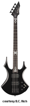 VIRGIN BASS NT | - offset double cutaway mahogany body with a rounded bottom and forward pointed horns, mahogany NTB, 24-fret ebony fingerboard with custom spider inlays at the 1-2nd, 11-13th, and 20-24th frets, pointed headstock with black overlay and logo, four-on-one-side tuners, heavey adj. bridge, two B.C. Rich bass humbucker pickups, three knobs (two v, tone), three-way pickup switch, three mini switches (two series/parallel and one phase in/out), black hardware, available in Onyx finish, 34 in. scale, new 2008. |