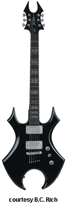 B.C. RICH | ELECTRIC: VIRGO SERIES | The Virgo is a combination of the Virgin and Warlock shapes. In a sense, the Virgo is a special edition model because a new model is released every year at the NAMM show. | VIRGO 2005 | - symmetrical double cutaway nato beveled body, bolt-on neck, 24-fret ebony fingerboard with skull inlays, matching headstock with three-per-side tuners, STB, one humbucker and one rail pickup, two knobs, three-way switch, black hardware, available in Black with white bevels or White with black bevels, 25.5 in. scale, disc. 2005. |