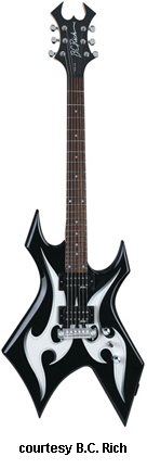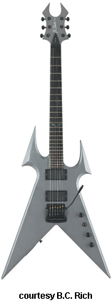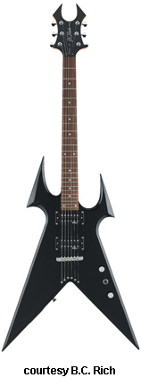 KERRY KING METAL MASTER WARLOCK | - offset double cutaway basswood body with pointed forward horns and large centered"V" cutaway in bottom bout, bolt-on maple neck, 24-fret rosewood fingerboard with dot inlays, Widow-style headstock with black overlay and logo, three-per-side tuners, wrap around fixed bridge/tailpiece, two B.C. Rich exposed humbucker pickups, two knobs (v, tone), three-way pickup switch, chrome hardware, available in Black finish with red blade or silver blade graphics, 25.5 in. scale, mfg. 2006-present. |