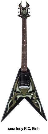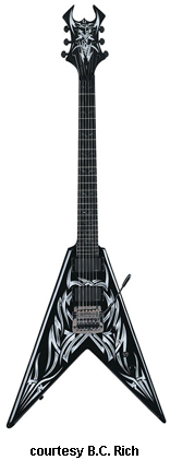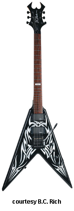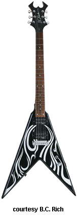 KERRY KING V SIGNATURE PACK | - Flying V-style basswood body, bolt-on hard maple neck, 24-fret rosewood fingerboard with 12th fret KKV inlay, Widow-style headstock with three-per-side tuners, one-piece adj. fixed bridge, two EMG-style B.C. Rich humbucker pickups, three knobs (two v, tone), three-way switch, black hardware, available in Black finish with silver Tribal graphics, 25.5 in. scale, disc. 2006. |