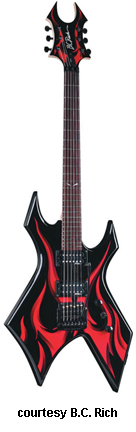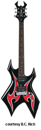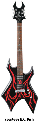 KERRY KING WARLOCK ONE WARTRIBE | - offset double cutaway basswood body with pointed forward horns and large centered"V" cutaway in bottom bout, bolt-on maple neck, 24-fret rosewood fingerboard with 12th fret custom inlay, Beast-style headstock with black with red fire graphic overlay and logo, three-per-side tuners, Floyd Rose-style double locking tremolo bridge, two B.C. Rich exposed humbucker pickups, two knobs (v, tone), three-way pickup switch, black hardware, available in Black finish with red fire graphics, 25.5 in. scale, mfg. 2007-present. |