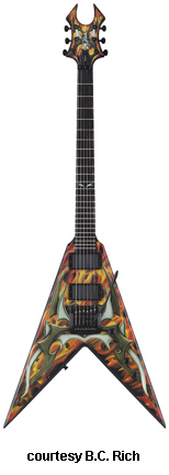 B.C. RICH | ELECTRIC: KERRY KING SIGNATURE SERIES | All guitars in this category are signatures or variations of Kerry King of Slayer. The Kerry King Wartribe I guitar pack features a Warlock guitar with Black finish and fire graphics, an amp, gig bag, guitar strap, poster, headsweat, and picks. Last Retail was $544 (100%/New condition was $380). | KKV KERRY KING SIGNATURE JUNIOR V (U.S. NECK-THROUGH-BODY) | - similar to the Junior V Standard, except has mahogany body wings, mahogany neck, figured maple top, ebony fingerboard with abalone diamond inlays, blackface reverse headstock with Kerry King/B.C. Rich logos, locking Floyd Rose or Kahler tremolo, available in Trans. Black Sunburst, Trans. Blue, or Trans. Magenta finishes, mfg. 1998-99. |
