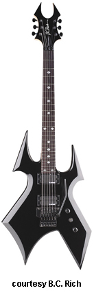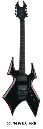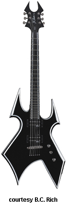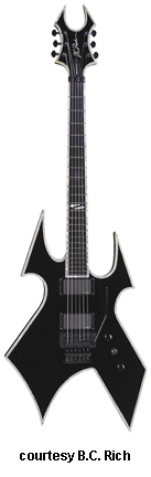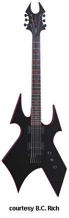 WARBEAST BLOOD BOUND | - offset double cutaway basswood body with pointed horns and a lower V-shaped cutout, red binding, bolt-on maple neck, 24-fret red-bound rosewood fingerboard with red diamond inlays, Beast-style red-bound headstock with black overlay and red logo, three-per-side tuners, tune-o-matic bridge, STB, two B.C. Rich exposed humbucker pickups, two knobs (v, tone), three-way pickup switch, black hardware, available in Onyx finish, 25.5 in. scale, mfg. 2008-present. |