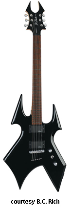 WARBEAST ONE | - offset double cutaway basswood body with pointed horns and a lower V-shaped cutout, bolt-on maple neck, 24-fret rosewood fingerboard with no inlays, Beast-style headstock with black overlay and logo, three-per-side tuners, tune-o-matic bridge, STB, two B.C. Rich EMG-style pickups, two knobs (v, tone), three-way pickup switch, chrome hardware, available in Black finish, 25.5 in. scale, mfg. 2007-present. |