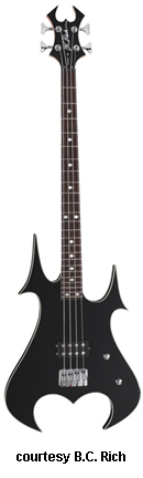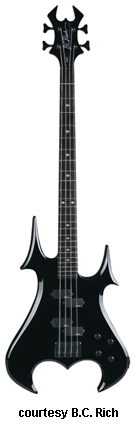 ZOMBIE REVENGE | - slightly offset sharp double cutaway basswood body with a pointed U cutout of bottom, bolt-on maple neck, 24-fret rosewood fingerboard with pearl diamond inlays, Widow-style headstock with black overlay and logo, two-per-side tuners, adj. stop bridge, single B.C. Rich humbucker pickup, two knobs (v, tone), chrome hardware, available in Onyx finish, 34 in. scale, new 2008. |