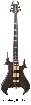 ZOMBIE EXOTIC CLASSIC BASS | - slightly offset sharp double cutaway alder body with a pointed U cutout of bottom, striped ebony top and back, maple NTB with ebony stringers, 24-fret rosewood fingerboard with pearl crown inlays, matching finish striped ebony headstock overlay with logo, two-per-side tuners, individual saddle bridge, two B.C. Rich soapbar pickups, five knobs (v, blend, b, m, t), active electronics with passive mini switch, available in Natural finish, 34 in. scale, mfg. 2008-present. |