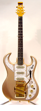 THE SCORPION | - updated version of the 1980s Scorpion, double cutaway, alder body, bolt-on rock maple neck, 24-fret MOP bound fingerboard with dot inlay, two Burns split humbucker pickups, two pickguards, three knobs, two switches, three-per-side tuners, Scorpion headstock, black hardware, available in "Gothic" satin black, mfg. 2003-05. |
