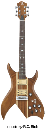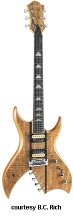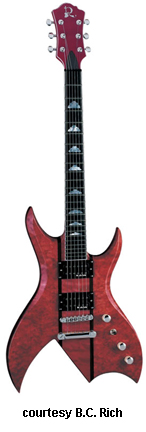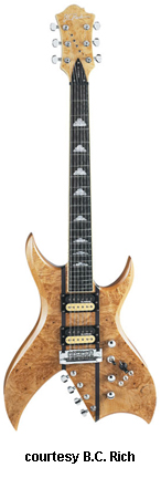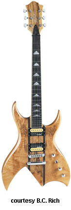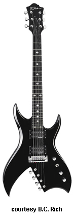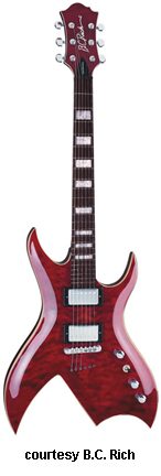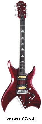 Bich (Platinum Series) | - similar to the Bich U.S.: Bolt-on, except has 24.75 in. scale, B.C. Rich three-per-side headstock with Platinum logo, die cast tuners, additional toggle switch, available in Black, Metallic Red, or White finish, disc. 2006. |