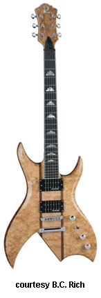 BICH PERFECT 10 | - 10-string configuration (six tuners on the headstock, the top four strings have octave strings with tuners on the bottom bout), offset double cutaway with bottom cutout mahogany beveled body, quilted maple top, maple NTB, 24-fret bound ebony fingerboard with pearl cloud inlays, bound quilted maple matching finish headstock overlay with logo, three-per-side tuners, B.C. Rich Quad bridge, two Rockfield Mafia exposed zebra humbucker pickups, three metal knobs (two v, tone), one five-way rotary varitone filter chickenhead knob, three-way pickup switch, three mini switches (individual coil taps and a reverse phase), chrome hardware, available in Dragon Blood with ebony stringers or Natural with walnut stringers finish, 24.625 in. scale, mfg. 2007-present. |