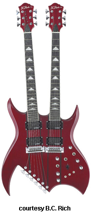 BICH DOUBLENECK (CURRENT MFG.) | - doubleneck configuration with one six-string neck and one 12-string neck, offset double cutaway with bottom cutout mahogany beveled body, maple NTB, 24-fret bound ebony fingerboard with pearl cloud inlays, bound matching finish headstock overlays with logo, three-per-side tuners (octave tuners for the 12-string are strung at the bottom of the body like the Bich 10), B.C. Rich Quad bridges, four Rockfield Mafia exposed zebra humbucker pickups (two per neck), six-string controls: three knobs (two v, tone), three-way pickup switch, three mini switches (two coil taps and a reverse phase), and a five-way rotary varione filter, 12-string controls: three metal knobs (two v, tone), three-way pickup switch, neck selector switch, chrome hardware, available in Trans. Red finish, 24.625 in. scale, new 2009. |