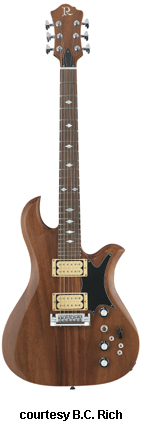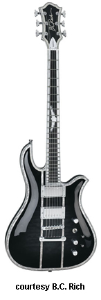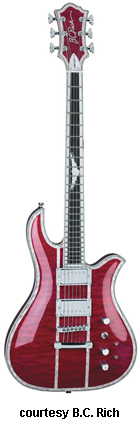 EAGLE (NJ CLASSIC SERIES) | - offset double cutaway body, quilted maple top, NTB visible hard rock maple neck, 24-fret ebony fingerboard with cloud inlays, classic BC Rich rosewood headstock with three-per-side tuners, tune-o-matic bridge, stop tailpiece, two exposed humbucker pickups, three knobs (two v, tone), three-way pickup switch, chrome hardware, available in Natural, Trans. Blue, or Trans. Red finish, 25.5 in. scale, mfg. 2006 only. |