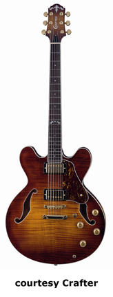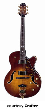 CRAFTER | ELECTRIC ARCHTOP | | FEG-780 | - single cutaway deep full-acoustic archtop body, tiger maple top, back, and sides, two bound f-holes, top and back binding, 20-fret bound fingerboard with pearl dot and 12th fret special inlays, three-per-side Grover tuners, adj. rosewood bridge, metal trapeze tailpiece with a wire design and rosewood top, raised tortoise pickguard, two covered humbucker pickups, four knobs (two v, two tone), three-way pickup switch, gold hardware, available in Natural finish, mfg. summer 2005-present. |