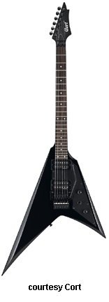 VX-2V | - Flying V-shaped agathis body with a longer bass wing than treble wing and beveled edges, bolt-on five-piece Stripe reinforcement modern profile neck, 24-fret rosewood fingerboard with white dot inlays, matching finish headstock, six-on-one-side tuners, double locking III tremolo bridge, carbon fiber pattern pickguard, two EMG-HZ exposed humbucker pickups, two knobs (v, tone), three-way pickup switch, black hardware, available in Black or Silver Metallic finish, gig bag included, 25.5 in. scale, new 2008. |