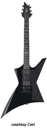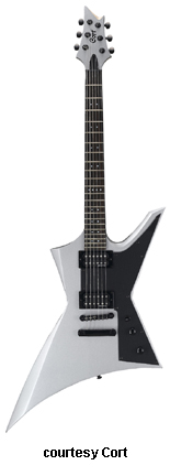 VX-4X | - X-shaped mahogany body with a longer lower bass wing and upper treble wing and beveled edges, set three-piece maple modern C-shaped neck, 22-fret rosewood fingerboard with custom VX inlays, matching finish headstock, three-per-side tuners, Tone Pros licensed tune-o-matic bridge, stop tailpiece, carbon fiber pattern pickguard, two EMG-HZ H4 pickups, two knobs (v, tone), three-way pickup switch, black hardware, available in Black Metallic or White Pearl finish, case included, 24.75 in. scale, new 2008. |