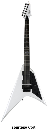 VX-4V | - Flying V-shaped mahogany body with a longer bass wing than treble wing and beveled edges, set three-piece maple modern C-shaped neck, 24-fret rosewood fingerboard with custom VX inlays, matching finish headstock, six-on-one-side tuners, double locking II tremolo bridge, carbon fiber pattern pickguard, two EMG-HZ H4 pickups, two knobs (v, tone), three-way pickup switch, black hardware, available in Black Metallic or White Pearl finish, case included, 25.5 in. scale, new 2008. |