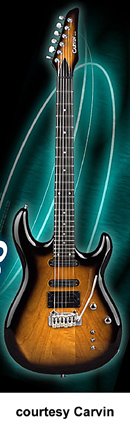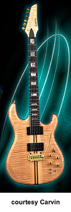 DC400A Anniversary | - similar to the DC400 except is an anniversary model that celebrates Carvin's 50th year (1946-1996), features a highly figured flamed maple topand headstock, five piece mapleand walnut laminated through-neck, three piece laminated body with fully rounded edges, available in various colors, mfg. 1996-present. |
