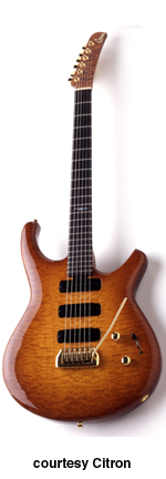 CS1 | - offset double cutaway swamp ash or mahogany body, bolt-on hardrock maple or mahogany neck, rosewood, pao-ferro, ebony, or maple fingerboard, six-on-one-side locking tuners, tremolo, three Citron custom blended single coil pickups, two controls (v, tone), five-way selector switch, current mfg. |