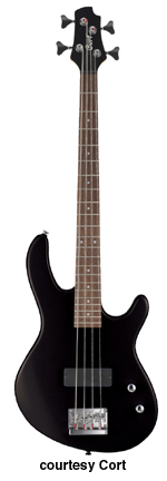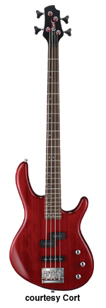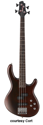 CORT | ELECTRIC BASS: ACTION BASS SERIES | | ACTION BASS | - offset double cutaway Agathis body, bolt-on hard rock maple neck, 24-fret rosewood fingerboard with offset dot inlays, black squared headstock, fixed bridge, chrome hardware, two-per-side tuners, two Power Sound P/J-style pickups, volume/blend/tone controls, available in Amber Satin, Black, Trans. Blue, Trans. Red, or Walnut Satin finish, 34 in.scale, current mfg. |
