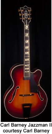 CARL BARNEY GUITARS | Instruments currently built in Southbury, CT since 1968. | Luthier Carl Barney started building classical guitars in 1968, and built his first archtop guitar in 1972. Two years later, Barney built a guitar for jazz legend Sal Salvador and began a long friendship and collaboration with Salvador (Barney later created the Sal Salvador Artist model for Salvador in 1980). All guitars are handcrafted by Barney in his workshop. Since the mid-1970s, Barney has been searching and stockpiling fine instrument woods. In 1976, Barney purchased a good-sized quantity of Gabon ebony, as well as Brazilian and Indian rosewood. Barney currently uses figured woods for all models, and has a supply of figured maple for special commissions. Barney began using Adirondack (American Red) spruce for guitar tops since 1993, which is whiter in appearance than the Sitka spruce that is also available. Although archtops have been Barney's focus since 1974, he has also built over one hundred classical, flat-top acoustics, and solid body electrics since the mid-1970s. For more information, visit Barney's website or contact him directly (see Trademark Index). | | ELECTRIC |