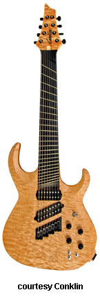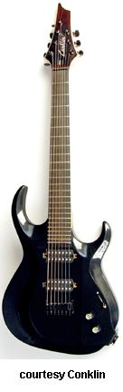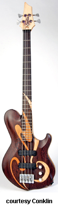 CONKLIN | Instruments currently built in Springfield, MO since 1984. Distributed by Conklin Guitars in Springfield, MO. | Bill Conklin began producing one-of-a-kind custom instruments in 1984 after designing the Quick Co-Necked Double Neck; a guitar and bass component system in which the individual instruments can be played separately or in their doubleneck configuration. Early Conklin models incorporate traditional body styles as well as more outlandish signature models like the Boomerang, Elec-trick, or the Shadow. Conklin guitars were offered with many custom options, such as custom finishes and graphics, electronic packages, and fingerboard inlays. In 1991, Conklin offered an entirely new guitar construction technique called Melted Tops. These three-piece and five-piece tops differ from the standard bookmatched variety in that they consist of different species of wood joined with virtually flawless joints. Each Melted Top is unique in its species selection, orientation, and grain patterns - which ensures a limitless combination of exotic tops. The Melted Top configuration is offered on all Session Model versions of Conklin instruments. The Sidewinder seven-string bass was introduced in 1992, and offered such features as full stereo panning, pickup splitting, an on-board parametric EQ, and the full range and versatility of up to a three-octave fingerboard. Tuned from the low B to high F, the Sidewinder seven-string is perfect for chording, soloing, slap and funk styles. Currently, the Sidewinder body design is the basis for the New Century Bass series, and is available in four-, five-, six-, and seven-string configurations. Another innovative addition to the Conklin product line is the M.E.U. or Mobile Electric Upright bass. Introduced in 1995, this electric upright bass is strapped on like an electric bass but hangs on the body in an upright position. The M.E.U.can be plucked or bowed, and is fully mobile and easily transported. It's even small enough to fit the overhead compartment of most airplanes. The past several years have shown tremendous growth from Bill Conklin and the staff from Conklin Guitars. Conklin credits a large part of his success to the practice of listening and catering to the wants and needs of each individual customer. Conklin als offers handcrafted instruments with numerous custom options. All Conklin instruments carry a limited lifetime warranty. For more information refer to Conklin's website or contact them directly (see Trademark Index). | | CUSTOM SHOP | ELECTRIC: NEW CENTURY SERIES | ELECTRIC: GROOVE TOOLS SERIES | ELECTRIC BASS: NEW CENTURY SERIES | ELECTRIC BASS: GROOVE TOOLS SERIES | ELECTRIC BASS: MEU SERIES |