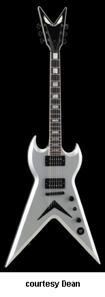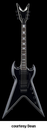 SPLITTAIL (MODEL SPLT) | - hybrid design with the bottom half of a V and the top half of an SG-style guitar, mahogany body, mahogany neck, 22-fret bound rosewood fingerboard with pearl block inlays, bound V-shaped headstock with black overlay and Dean wings logo, three-per-side Grover tuners, tune-o-matic bridge, STB that runs through a V-shaped metal tailpiece, two USA Dean Time Capsule exposed humbucker pickups, two metal knobs (v, tone), three-way pickup switch, black hardware, available in Classic Black, Dark Cherry, or Metallic Silver finish, 24.75 in. scale, new 2008. |