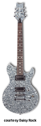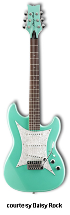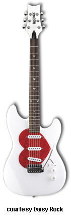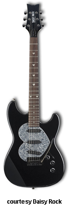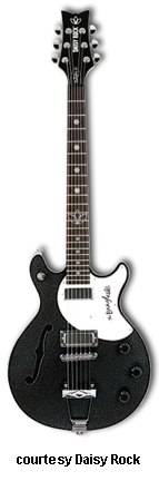 BANGLES SIGNATURE MODEL | - symmetrical double cutaway semi-hollow basswood body, single f-hole on the bass bout, white body binding, bolt-on maple neck, 22-fret rosewood fingerboard with daisies and 11-13th fret Lotus inlays, matching finish headstock, three-per-side Grover tuners, tune-o-matic bridge, trapeze tailpiece, white pickguard with "The Bangles" graphic, two covered mini-humbucker pickups, three barrel knobs (two v, tone), three-way pickup switch, chrome hardware, available in Metallic Black finish, 24.75 in. scale, new 2008. |
