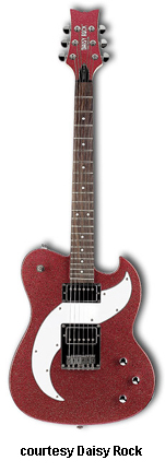 TOM BOY DEUCE | - single cutaway Telecaster-style design, agathis body, bolt-on maple neck, 22-fret rosewood fingerboard with dot inlays, matching finish headstock with three-per-side tuners, Telecaster-style bridge, narrow white swirl pickguard, two Duncan Designed humbucker pickups, three knobs (two v, tone), three-way pickup switch, chrome hardware, available in Rainbow Sparkle or Ruby Sparkle finish, mfg. 2007-present. |