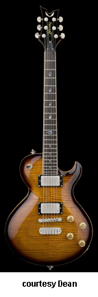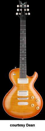 DEAN | ELECTRIC: SOLTERO SERIES | | SOLTERO | - single cutaway Les Paul-style mahogany body, carved flame maple top, body binding, set mahogany neck, 22-fret rosewood fingerboard with custom abalone inlays, black headstock overlay, three-per-side Grover tuners, tune-o-matic bridge, slotted stop tailpiece, two Dean Vintage-style covered humbucker pickups, four knobs (two v, two tone), three-way pickup switch, chrome hardware, available in Classic Black, Classic White, Trans. Amber, or Trans. Braziliaburst finish, 24.75 in. scale, new 2008. |
