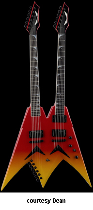DAVE MUSTAINE DOUBLENECK USA (MODEL USAVMNTDN) | - double neck configuration with a 12-string neck and six-string neck, double Flying V-style mahogany body with bevels, D-shaped Mustaine profile mahogany necks, 24-fret ebony fingerboards with pearl sharks tooth and small dot inlays, bound headstocks with six-on-on-side tuners (12-string neck has six additional tuners at the bottom of the guitar), Tone Pros tune-o-matic bridges, V-shaped black metal tailpieces, Dave Mustaine Duncan Live Wire pickups (one for the 12-string and two for the six-string), three knobs, three-way pickup switch, neck selector switch, black hardware, available in Blood Lust finish, 25.5 in. scale, Flight Case and Deth Certificate of Authenticity included, limited edition run of 50 instruments, new 2008. |