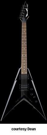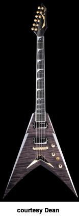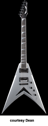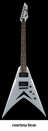 DAVE MUSTAINE SIGNATURE X (MODEL VMNT X) | - Flying V-shaped hardwood body with bevels, bolt-on maple Mustaine profile neck, 24-fret rosewood fingerboard with pearl dot inlays, matching finish headstock with signature, six-on-one-side mini Grover tuners, tune-o-matic bridge, V-shaped metal tailpiece, two Dean Design black exposed humbucker pickups, three knobs, three-way switch, black hardware, available in Classic Black or Metallic Silver finish, 25.5 in. scale, new 2008. |