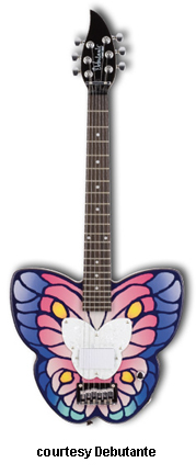 BUTTERFLY | - butterfly-shaped hardwood body, bolt-on maple neck, 22-fret rosewood fingerboard with dot inlays, three-per-side tuners, hard tail bridge, butterfly-shaped pearloid pickguard, single white humbucker pickup, single volume knob, chrome hardware, available in Fantasy finish (butterfly graphics), 22.5 in. scale, gig bag included, new 2008. |