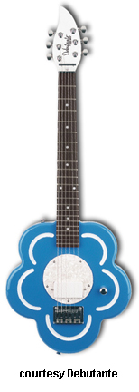 DAISY | - daisy-shaped hardwood body, bolt-on maple neck, 22-fret rosewood fingerboard with dot inlays, three-per-side tuners, hard tail bridge, circular pearloid pickguard, single white humbucker pickup, single volume knob, chrome hardware, available in Awesome Blue or Pepper Mint finish with white graphics, 22.5 in. scale, gig bag included, new 2008. |