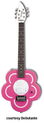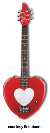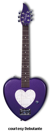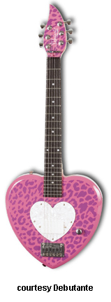 HEARTBREAKER | - heart-shaped hardwood body, bolt-on maple neck, 22-fret rosewood fingerboard with dot inlays, matching finish headstock, three-per-side tuners, hard tail bridge, heart-shaped pearloid pickguard, single white humbucker pickup, single volume knob, chrome hardware, available in Cheetah (pink with purple cheetah graphics), Pink Heart, Princess Purple, or Red Hot Red finish, 22.5 in. scale, gig bag included, new 2008. |