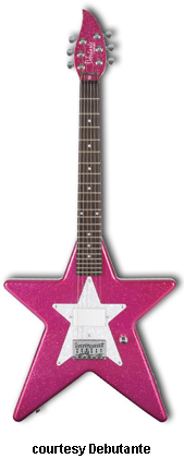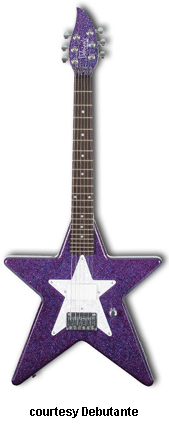 STAR | - star-shaped hardwood body, bolt-on maple neck, 22-fret rosewood fingerboard with dot inlays, matching finish headstock, three-per-side tuners, hard tail bridge, star-shaped pearloid pickguard, single white humbucker pickup, single volume knob, chrome hardware, available in Atomic Pink or Cosmic Purple finish, 22.5 in. scale, gig bag included, new 2008. |