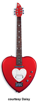 DAISY HEARTBREAKER (ARTIST) | - heart-shaped basswood body, bolt-on rock maple neck, rosewood 22-fret fingerboard with pearloid heart inlay, matching color painted headstock with three-per-side tuners, two pickups (Duncan Design humbuckerand single coil), two knobs (volume, tone), three-way switch, heart shaped pickguard, hardtail bridge, chrome hardware, available in Blackheart, Cheetah (2006 only), Pink Heart, Princess Purple, or Red Hot Red finish, 24.75 in. scale, mfg. 2002-07. |