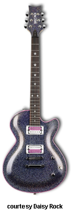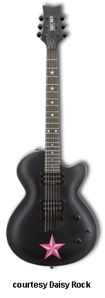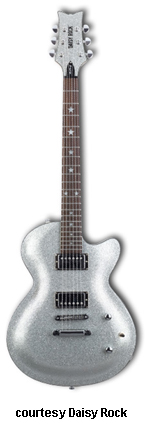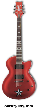 DAISY ROCK STAR | - Double cutaway basswood body, bolt-on maple neck, 22-fret rosewood fingerboard, two humbucker pickups two knobs (volume, tone) 3-way switch, features built-in amplifier and speaker just below bridge, 9-volt powered, chrome hardware, available in Super Nova Red or Super Sonic Silver finishes, mfg. 2001 only. |