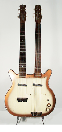 DOUBLENECK #3923 | - 4-string bass/6-string guitar, "Shorthorn" style Masonite body with vinyl edging, two pickups, concentric knobs, clear pickguards, input jack on lower body edge, "Coke bottle" headstocks, Bronze and White Sunburst only, introduced 1958, phased out 1969. |