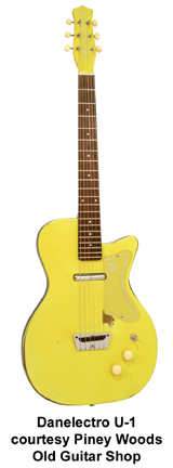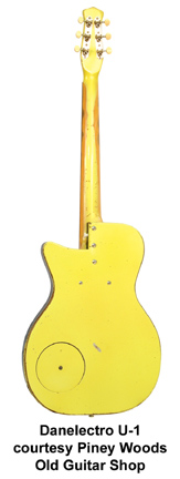 DANELECTRO | ELECTRIC: FIRST MODEL, C, U, & DOUBLE NECK SERIES | | 1954 FIRST MODEL | - single cutaway poplar wood body with vinyl edging, neck reinforcement consisted of a .75 in. square aluminum rod which ran from nut to bridge, "Bell"-shaped headstock with large rear volute and angled stenciled logo with "curly-cue" design (soon changed to vertical stenciled logo). Early versions had one or two pre-Lipstick tube pickups concealed under a thin single-ply white plastic pickguard, soon changed to lipstick tube pickups with clear pickguard with stenciled "D" logo and perimeter stripe, available in a variety of finishes and textured coverings including Black, Red, Bronze, Blue, and Yellow, extremely rare model, introduced 1954, phased out 1955. |