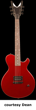 EVO S3 | - single cutaway basswood body, bolt-on maple neck, 22-fret rosewood with dot inlays, Dean V-shaped headstock with three-per-side tuners, wraparound bridge/tailpiece, single exposed humbucker pickup, single volume knob, black hardware, available in Metallic Red finish, mfg. 2006-07. |