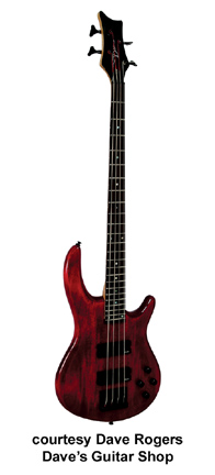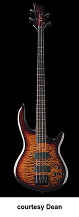 DEAN | ELECTRIC BASS: EDGE SERIES | The entire range of Edge bass models debuted in 1998. The Bespeak (Model DGP-BP) is an all-in-one starter system that includes an Edge One electric bass, a Dean bass amp, a guitar strap, Dean picks, and a guitar tuner. This complete package retails for $469. | EDGE 09M | - offset double cutaway basswood body, mahogany top, bolt-on maple neck, 22-fret rosewood fingerboard with white dot inlay, fixed bridge, two-per-side die cast tuners, vintage bridge, single soapbar pickups, two knobs, chrome hardware, available in Metallic Red or Satin Natural finish, current mfg. |
