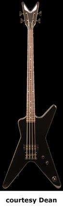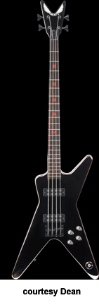 ML VINTAGE BASS (MODEL DGB-MLBX) | - Flying V-style with treble horn basswood body, bolt-on maple neck, 24-fret rosewood fingerboard with white dot inlay, fixed bridge, V-shaped peghead with screened logo, two-per-side tuners, chrome hardware, P/J-style pickups, three knobs (v1, v2, tone), available in Classic Black, Trans. Blue (disc.), Trans. Braziliaburst (disc.), or Trans. Red (disc.) finish, mfg. 1998-present. |