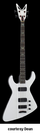 DEMONATOR | - offset double cutaway explorer style mahogany body, neck-thru design, Traditional V-style Dean headstock, MOP hourglass inlays, two active soapbar pickups, three knobs, two-per-side Grover tuners, black hardware, available in Classic Black or Classic White (new 2008) finish, mfg. 2003-present. |