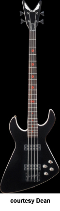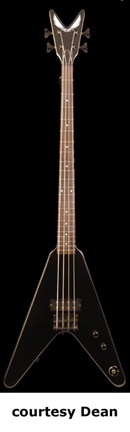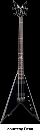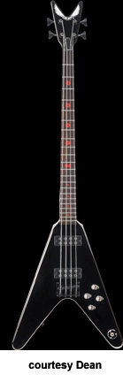 RAZORBACK V BASS | - Dimebag Darrel Flying V-style, basswood body, mahogany NTB, 22-fret rosewood fingerboard with Dime razor inlays, V-shaped headstock with two-per-side tuners, High Mass bridge, two active humbucker pickups, three knobs, black hardware, available in Classic Black or Classic Black with Green bevels finish, 35 in. scale, mfg. 2007-present. |