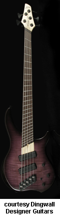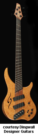 DINGWALL DESIGNER GUITARS | ELECTRIC BASS: AFTERBURNER SERIES | | AFTERBURNER I | - double cutaway maple body, maple bolt-on neck, 24-fret Novax Fanned Fret System fingerboard, two-per-side tuners, two Dingwall pickups, Passive Plus electronics, three knobs, black hardware, available in Black, Blueberry, Honeyburst, Natural, Trans. Black, Trans. Redburst, or Trans. Indigoburst finish, current mfg. |
