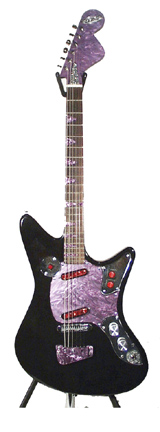 SATELLITE | - offset double cutaway poplar body, through-body maple neck, 22-fret bound rosewood fingerboard with V-Wedge inlays, matching pickguard finish headstock overlay, six-on-one-side tuners, Schaller roller bridge, VibroStar tremolo tailpiece, two Wilde Noiseless single coil pickups, Gold (Dark Green or Light Blue finish), Purple (Black finish), or White (Black, Navy, or Red finish) pickguard, two knobs (v, tone), two pickup on/off rocker switches, preset volume control stomp switch, chrome hardware, available in Blac, Dark Green, Light Blue, Navy, or Red finish 24 in. scale, mfg. 1995-99. |