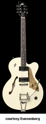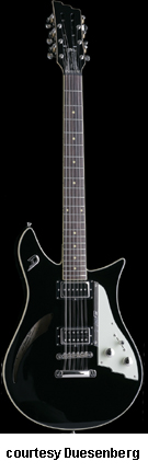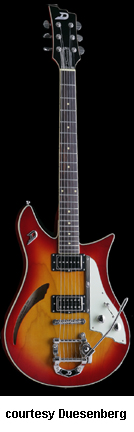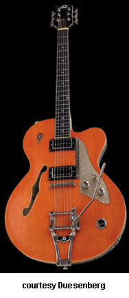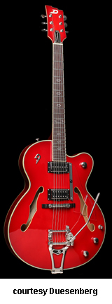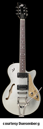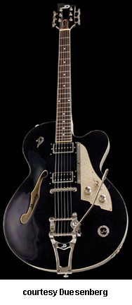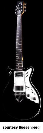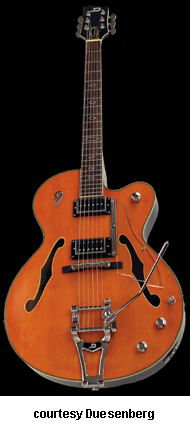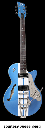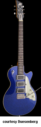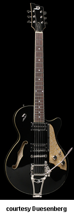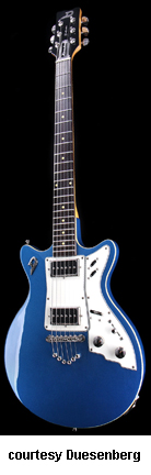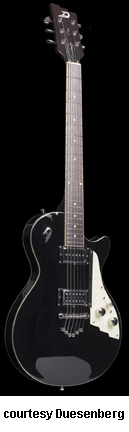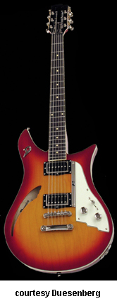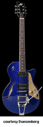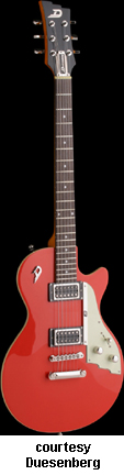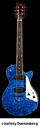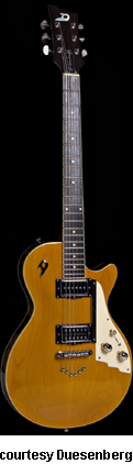 DUESENBERG | ELECTRIC | Duesenberg reports that 120 guitars were built in 1996. In 1998, the TV version of the Starplayer model was introduced, which features a sparkle finish on the guitars' tops, or sparkle finish on the guitars' headstocks. | 49ER | - single cutaway mahogany body, solid arched maple top, top and back binding, mahogany neck, 22-fret bound rosewood fingerboard with dot inlays, three-per-side tuners, tune-o-matic bridge, STB, small white pickguard, one P-90 (neck) and one humbucker (bridge) pickups, two knobs (v, tone), three-way pickup switch, chrome hardware, available in Black, Blue Pearl, or Honey finish, 25.5 in. scale, current mfg. |
