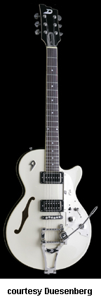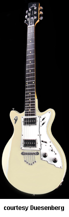 D-CASTER | - symmetrical double cutaway contoured solid alder body, bound body, set maple neck, 22-fret rosewood fingerboard with dot inlays, black headstock overlay, three-per-side tuners, adj. bridge with steel saddles, STB, two-piece white pickguard, two custom Duesenberg DP90 single coil pickups, two knobs (v, tone), two on/off slider switches for swell effect, volume swell switch, three-way pickup switch, chrome hardware, available in Black, Lake Placid Blue, or Vintage White finish, 25.5 in. scale, new 2008. |