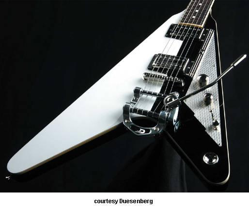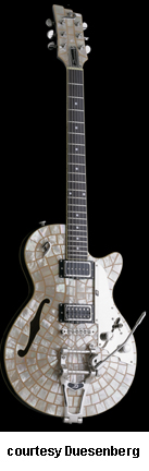 EMERALD PEARL/ICE PEARL MODEL | - single cutaway solid alder body with an arched circular MOP mosaic top, rock maple neck, 22-fret Indian rosewood fingerboard with dot inlay, matching finish MOP mosaic headstock overlay, three-per-side tuners, tune-o-matic style bridge, Duesenberg Bigsby-style tremolo tailpiece, brass pickguard, one Grand Vintage humbucker (neck) and one custom Duesenberg DP90 single coil (bridge) pickups, two knobs, three-way switch, nickel hardware, available in Emerald Pearl or Ice Pearl finish, 25.5 in. scale, current mfg. |